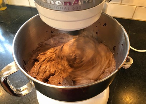 This next step is optional: to make a fluffier frosting, pour the cooled frosting into a mixing bowl and beat for a few minutes. This extra step gives the cake extra height.