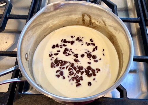 Using a whisk, stir the ingredients together. Do not let any water (for example, thru covering the pot, which could create condensate) get in the ganache. It is an emulsion, and as such, it could “seize” and turn the chocolate into a grainy liquid. Set aside and allow to cool.