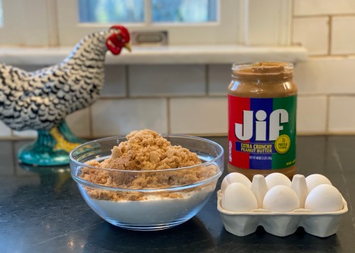 To make 6 dozen cookies, follow this recipe: 6 large eggs, 6 cups sugar (I use ½ white and ½ brown), and 6 cups of creamy or crunchy peanut butter (one 3-pound container).