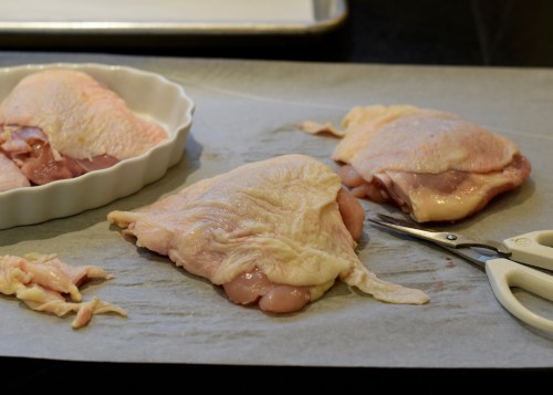 I use either bone-in or boneless, skinless thighs depending on what I have on hand. To keep the meat moist while it cooks, place a slice of lemon over each thigh.