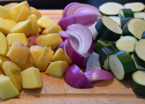 Prepare onions, zucchini, and potatoes as noted. Cut zucchini thickly so it won’t cook quickly and turn to mush.