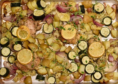 I sometimes daydream about foods that will taste and look good together on a sheet pan. This one hits all the buttons: it’s tasty, pretty, and healthy. It is loaded to the brim with chicken thighs covered in lemon slices, artichoke hearts, wedges of sweet red onion, bite-sized chunks of Yukon Gold potatoes, thick slices of zucchini, and sprigs of fresh thyme. It sparks joy.