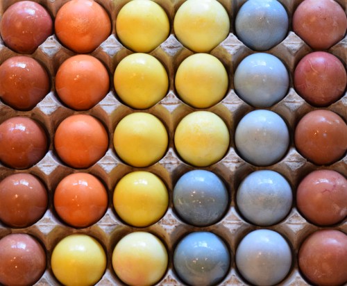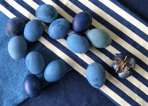 Some of the eggs did not take up the color. I redipped those eggs into an indigo dye bath. Wow! These shades of blue were delightful.
