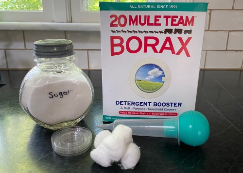 Mix Borax and sugar in warm water in a glass jar with a lid. Dip cotton balls into the mixture and place them onto small lids that serve as a tray. We made three of these trays and placed them close to the wall on the countertop. Do not place them on the floor where a child or pet could get to them.
