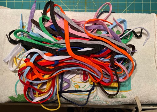 My husband gave me the idea to use shoelaces instead. I ordered an assortment of 54″ laces from Amazon.