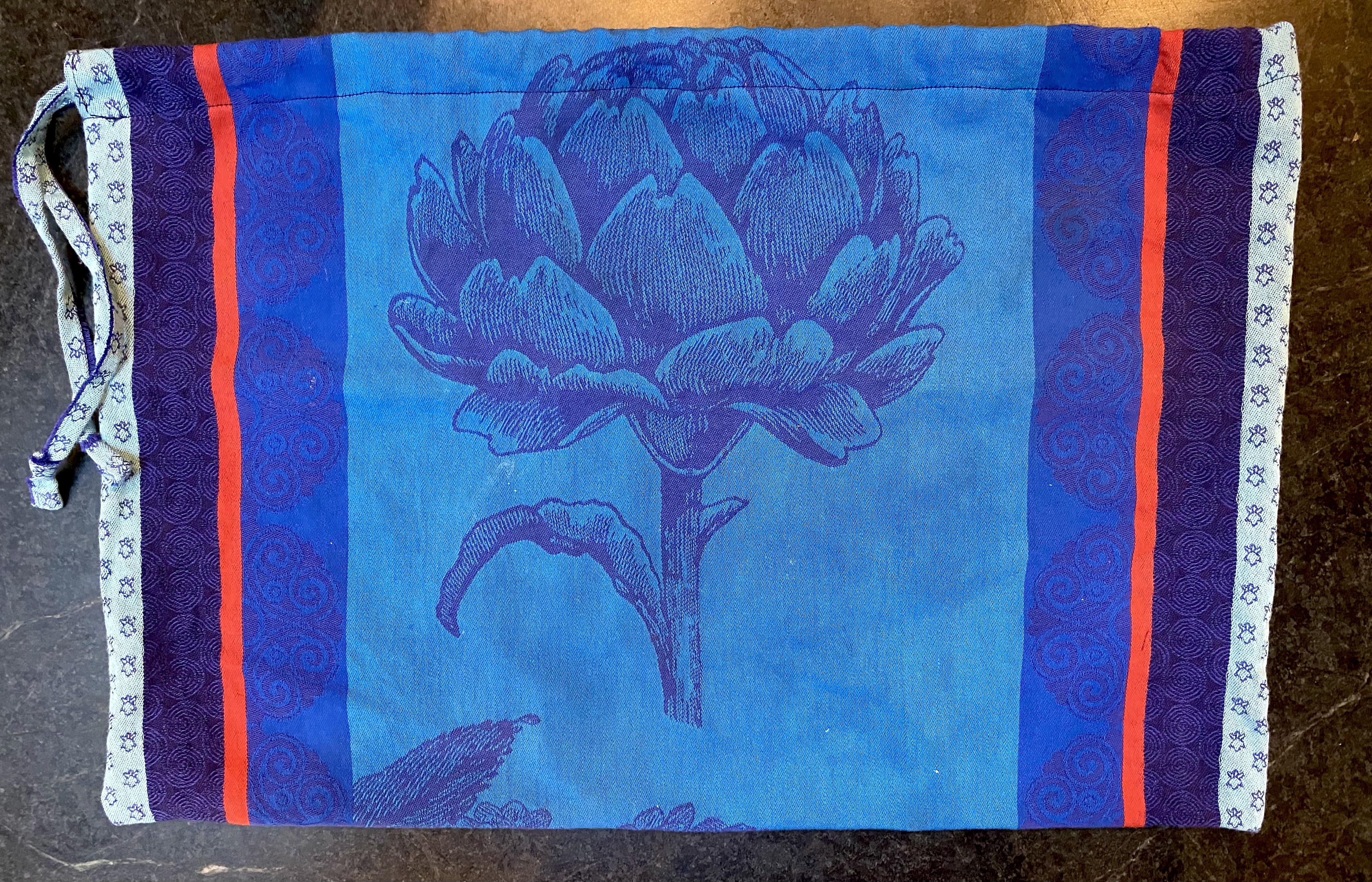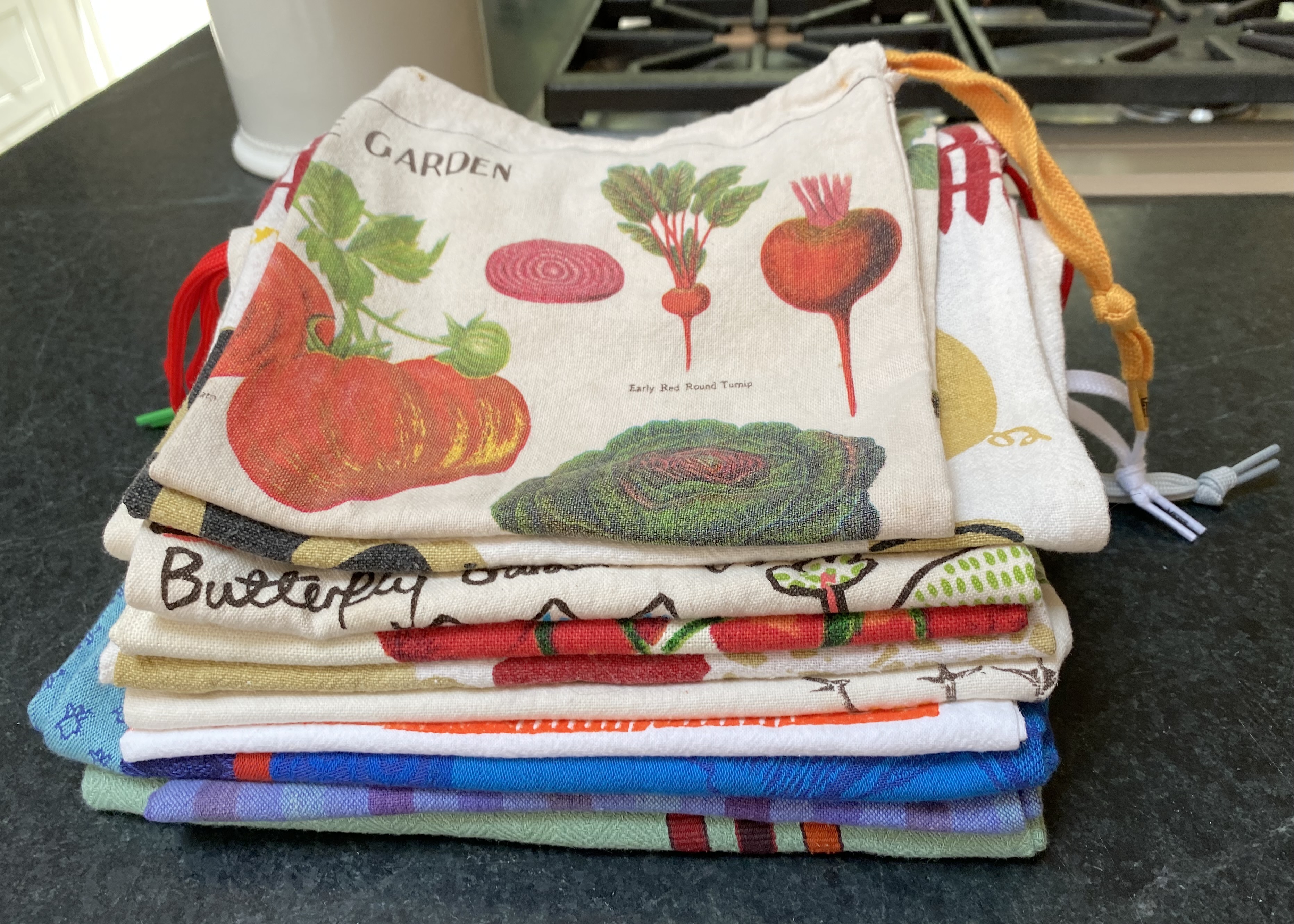 My dishtowel drawer is a hot mess smorgasbord of fruits, vegetables, flowers, chickens, funny sayings, and colorfully striped images, all printed on cotton rectangles. The super-absorbent among them, often dingy and stained, are the workhorses of my kitchen. The others, those with high sentimental value or less absorbency, have been smushed up in the back of the drawer for eons. They are the ones now being repurposed into vegetable storage bags.