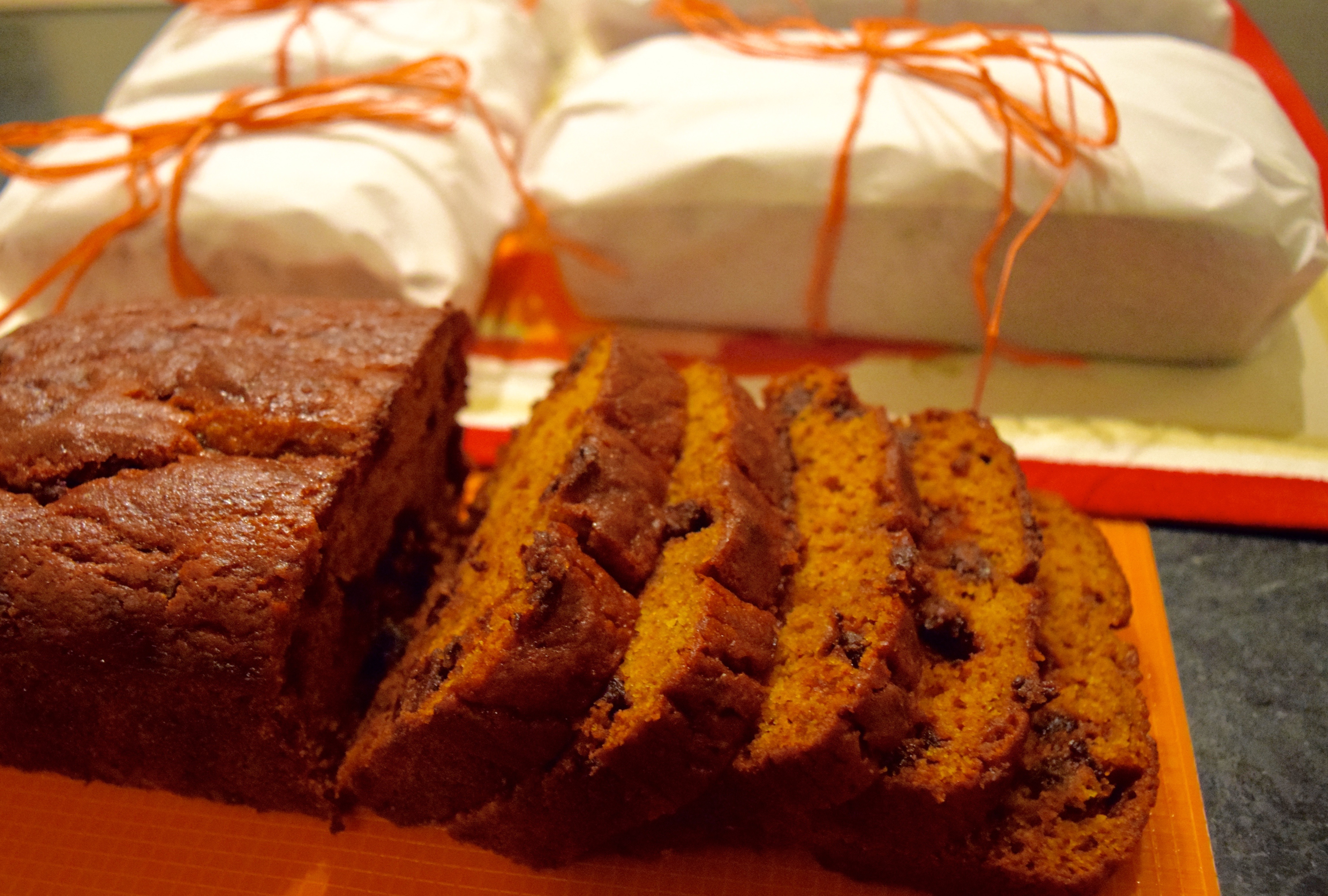 My cousin is famous for Marion’s Crazy Good Pumpkin Bread with Chocolate Chips.
