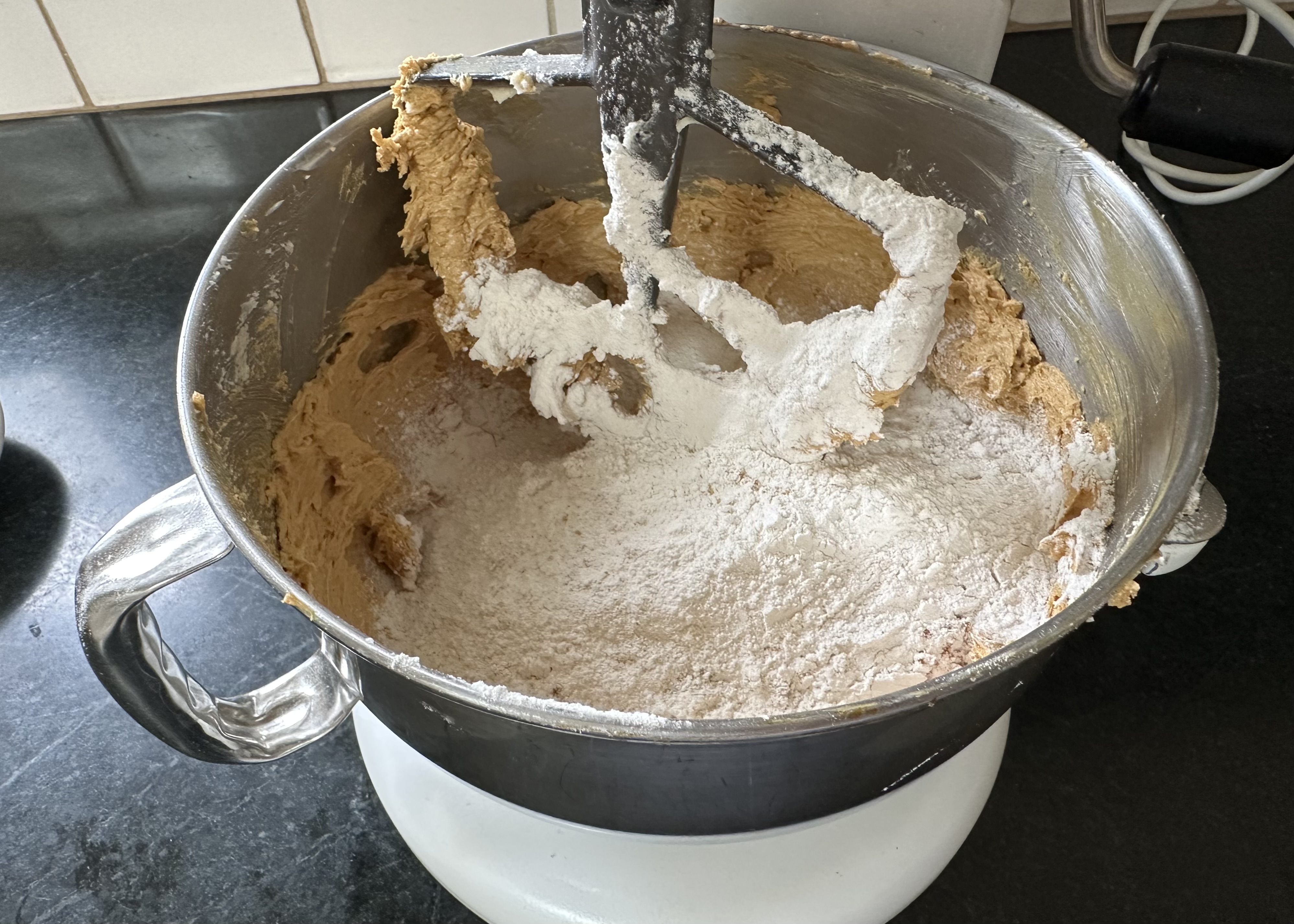 Add flour mixture. Mix slowly until white flour streaks disappear, about 30 seconds. At this point, you could cover dough and put in fridge and bake later.