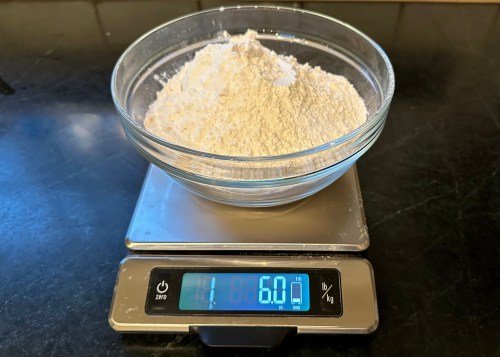 I weigh flour for consistent baking results. Place a bowl on a kitchen scale, zero out the bowl’s weight, and pour in flour until the scale reads 1 pound, 6 ounces. It’s easy peasy.