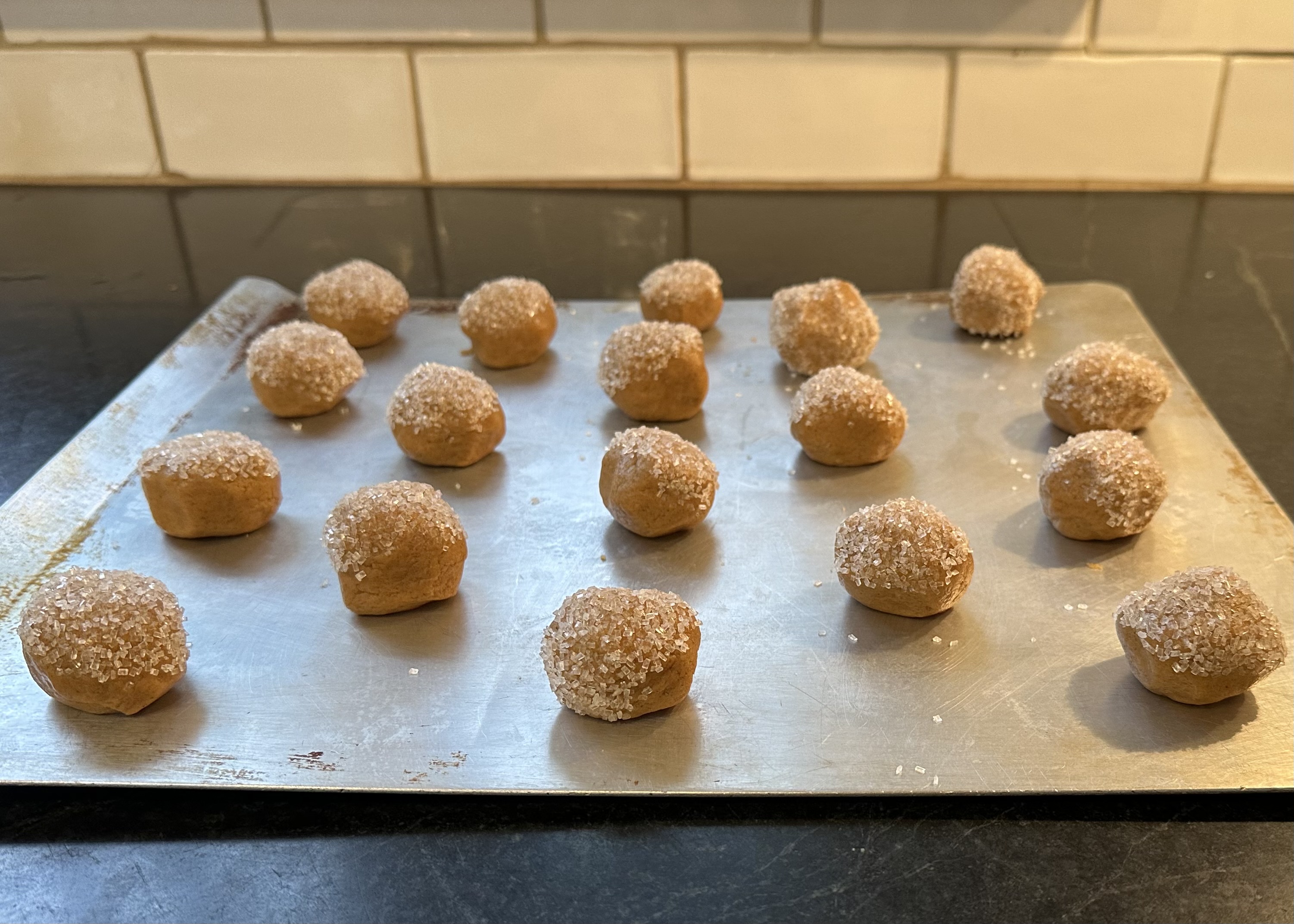 Dunk each ball’s top half into the sugar bowl and arrange on a cookie sheet about 2-inches apart.