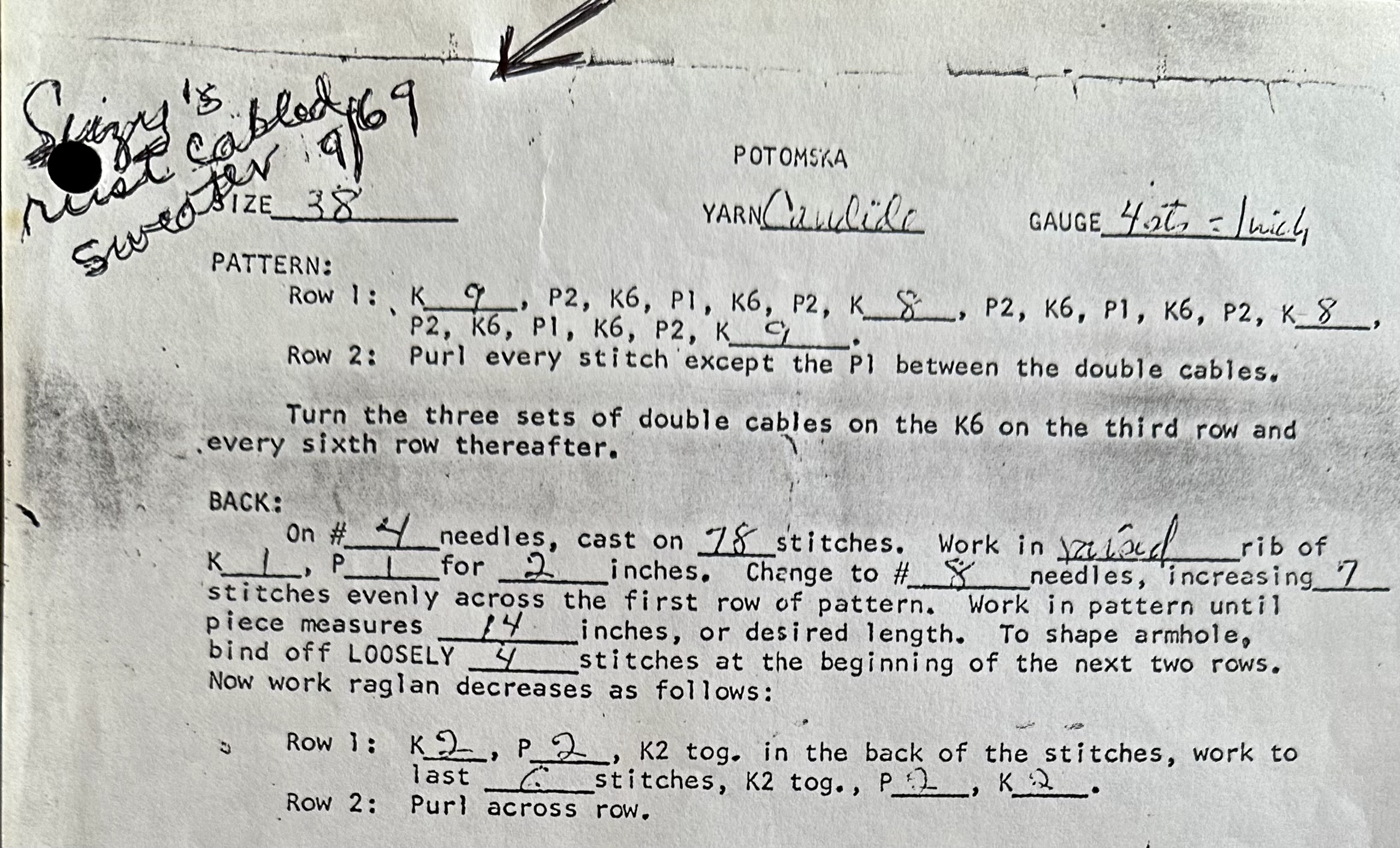 the beach community where sunbathing mothers sat on the jetty in aluminum foldup chairs knitting wool sweaters designed by local guru PS Straker, occasionally stopping to do mom things like rebait a child’s drop line. I can see my mom knitting my pink Candide cabled crewneck sweater– apparently, the same pattern my friend Suzy’s mom knit for her.