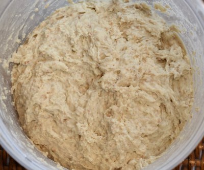 About Flours: This recipe calls for all-purpose (AP) unbleached flour. The authors use Publix’s brand. I bake with King Arthur flours which have more protein than other AP flours and thus require an extra ¼ cup of water, per the authors. The authors suggest bumping up the water to 3⅓ cups if using bread flour. The authors suggest not using cake or pastry flours.