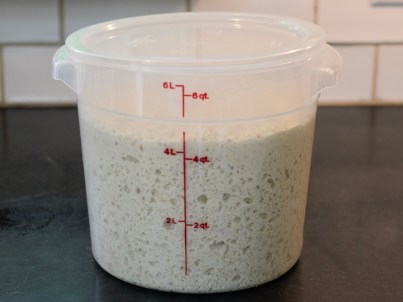 Add the warmed water. Mix the ingredients with a spatula, incorporating all of the flour from the bottom of the container. Put the lid on, but do not seal it so the gasses can escape. Allow dough to rest for two hours on the countertop. It won’t be resting though; the yeast will become activated by the water and the subsequent fermentation process that ensues will make the dough bubble and rise — and become delicious.