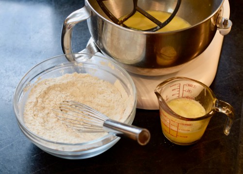About Flours: This recipe calls for all-purpose (AP) unbleached flour. The authors use Publix’s brand. I bake with King Arthur flours which have more protein than other AP flours and thus require an extra ¼ cup of water, per the authors. The authors suggest bumping up the water to 3⅓ cups if using bread flour. The authors suggest not using cake or pastry flours.