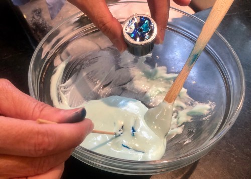 Gel food coloring has more color pigment than regular liquid food coloring, so you need less, and the colors are truer. The girls taught me to poke a hole through the foil lid with a toothpick and use it to add color to the frosting. We made three bowls of icing: white, sky blue, and pink.
