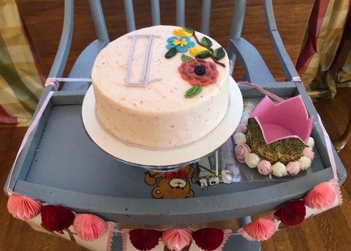 My son’s generation refers to a baby’s first birthday cake as a “smash” cake. Baked on 8th makes those as well. This one has strawberry frosting and was out of this world. The blue high chair was my husband’s father.