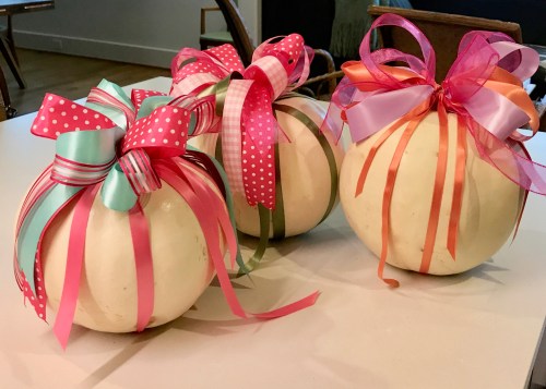 Both parties were designed with love and whimsy. For the baby shower, co-host Nan decorated white pumpkins with ribbons. I had never considered bedecking pumpkins, but I was suddenly ALL IN on the party spirit when I saw hers. Nan’s natural enthusiasm for life has a way of doing that to you.