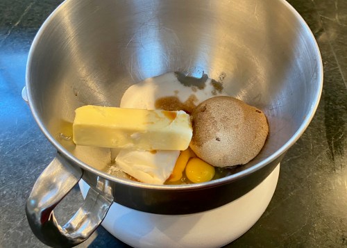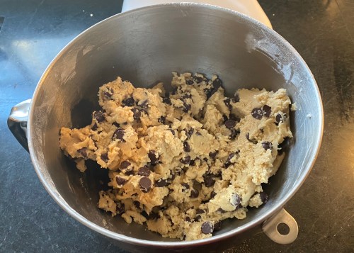 Add flour mixture. Mix slowly until white flour streaks disappear, about 30 seconds. At this point, you could cover dough and put in fridge and bake later.