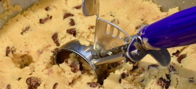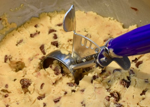 Add cookie dough by the spoonful (or use a #40 cookie scoop) to the baking sheet.