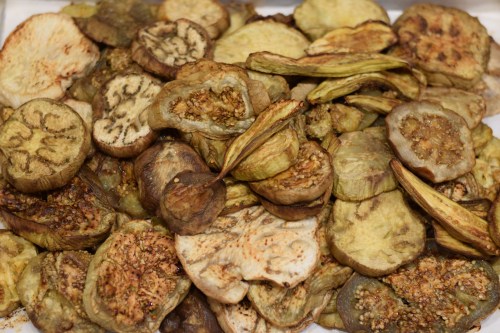 The roasted Romas are good to eat as an appetizer, a side dish, or as a mix-in for foods like hamburgers, vegetable dishes, and even over pasta. They are especially good smushed on bruschetta, or on crostinis, as we shall see. They will last in a covered dish for about a week in the refrigerator, or they can be frozen.