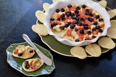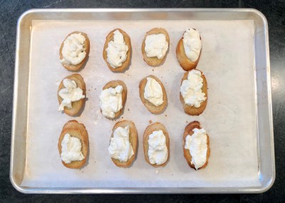 Slice a baguette into ½-inch slices. Lightly brush each with olive oil. Place slices on a sheet pan and toast for about 7-8 minutes.