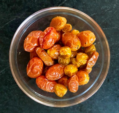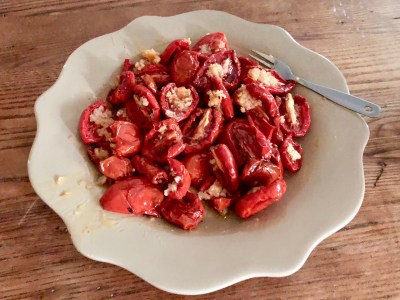 I asked her how she prepared them. She wrote, “Cut off the tips of Roma tomatoes, then cut them in half. Place in baking pan and sprinkle olive oil, salt, and pepper. Put a nice