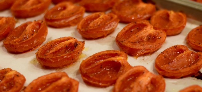 While the crust is cooking, remove the tomatoes from the colander and gently squeeze out the excess moisture with your hands. Pat the tomatoes dry with paper towels.