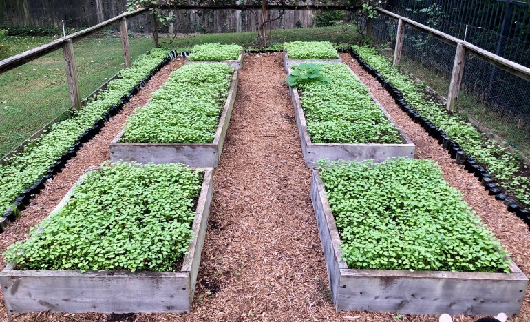 Here is a photo from yesterday. So much prettier than naked raised beds. The chickens love it, too.