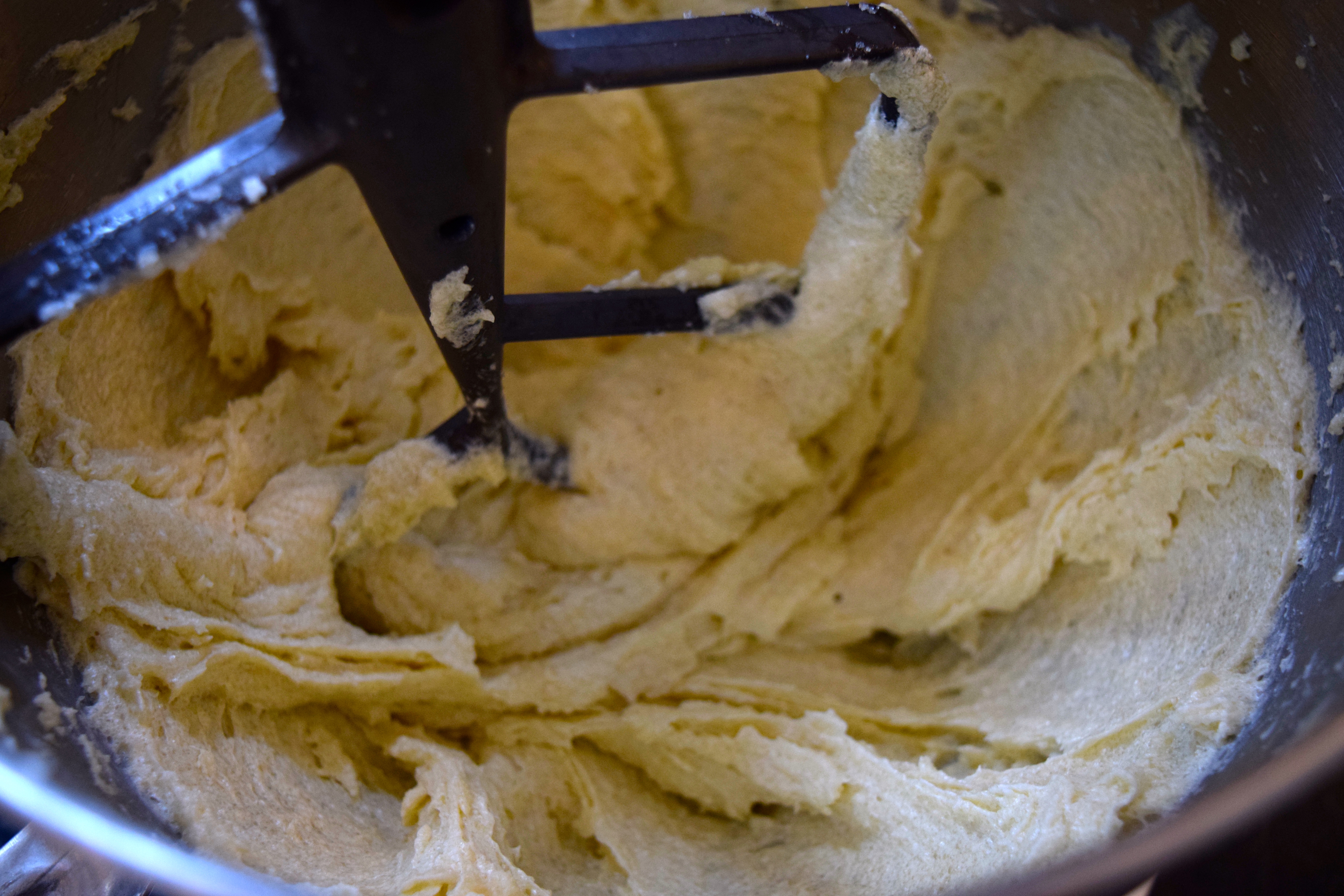 Add the liquids: sorghum, melted butter, water, and eggs, and mix on low-medium speed for about one minute.