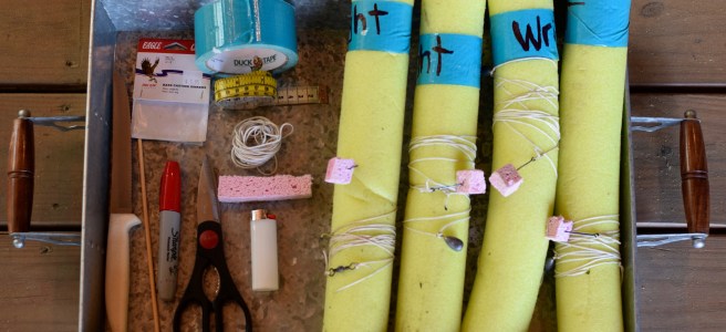 With the hook and sinker attached, wind the string around the noodle, tuck the hook into the styrofoam for safety, and store until ready to fish.