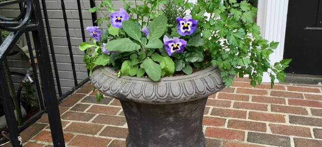 Me, too. Why not fill your front porch pots with cool weather herbs and pansies this spring? They’ll be easy to water because of their proximity to your house, and they’ll make you happy every time you walk in or out the front door.
