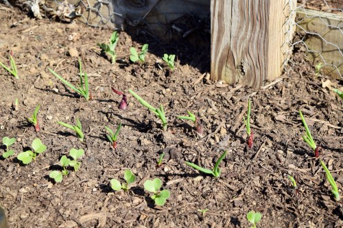 I planted lettuce seeds on March 10th, but those seeds never germinated. I think the ground was still too cold and wet. When I realized they were not going to germinate, I bought and planted a variety of lettuce plants. Later, in mid-April, I planted new lettuce seeds so I could have a succession of lettuce leaves to harvest. Those seeds germinated and can be seen growing between the larger plants.