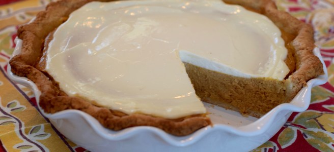 Note to self: use a thinner lipped pie crust shield the next time. Pumpkin pie rises like a soufflé as it cooks and this wide shield impeded that expansion. It turned out okay in the end because the marks left from the shield were covered up by the topping.