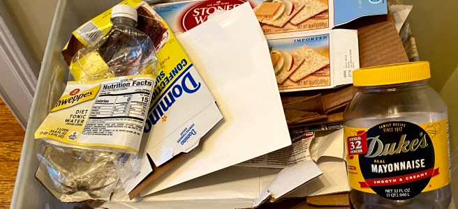 I have put some other No-No’s items in the recycle bin in the past, thinking I was responsible: broken plastic toys, metal chicken wire, empty paint cans, random pieces of wood. When in doubt, throw trash in the landfill bin, say the experts.