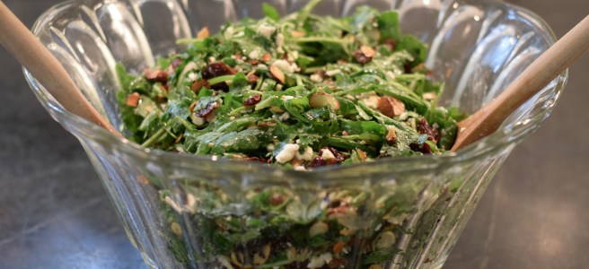 Just before serving, add the nuts and salad dressing. I like to use my own homemade salad dressing @judyschickens Everyday Salad Dressing. I sprinkle a little white balsamic vinegar over the greens for added “bite” before tossing. The greens collapse quickly, so don’t add dressing until ready to serve.