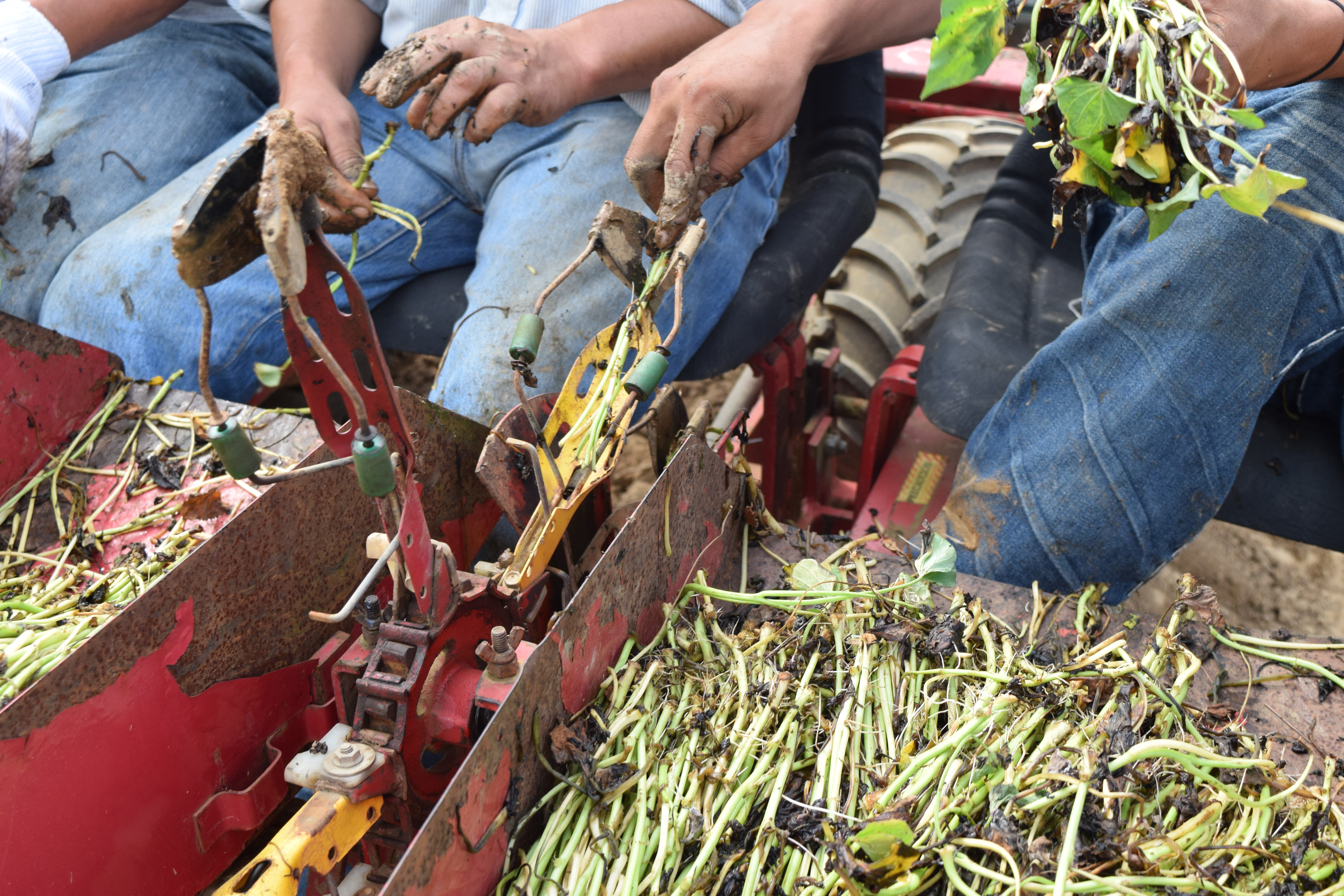 As the tractor moves forward, farmers in the red trailer feed sweet potato slips into a device that drops them in the ground, covers them with dirt, and gives them a sip of water from the yellow tank.
