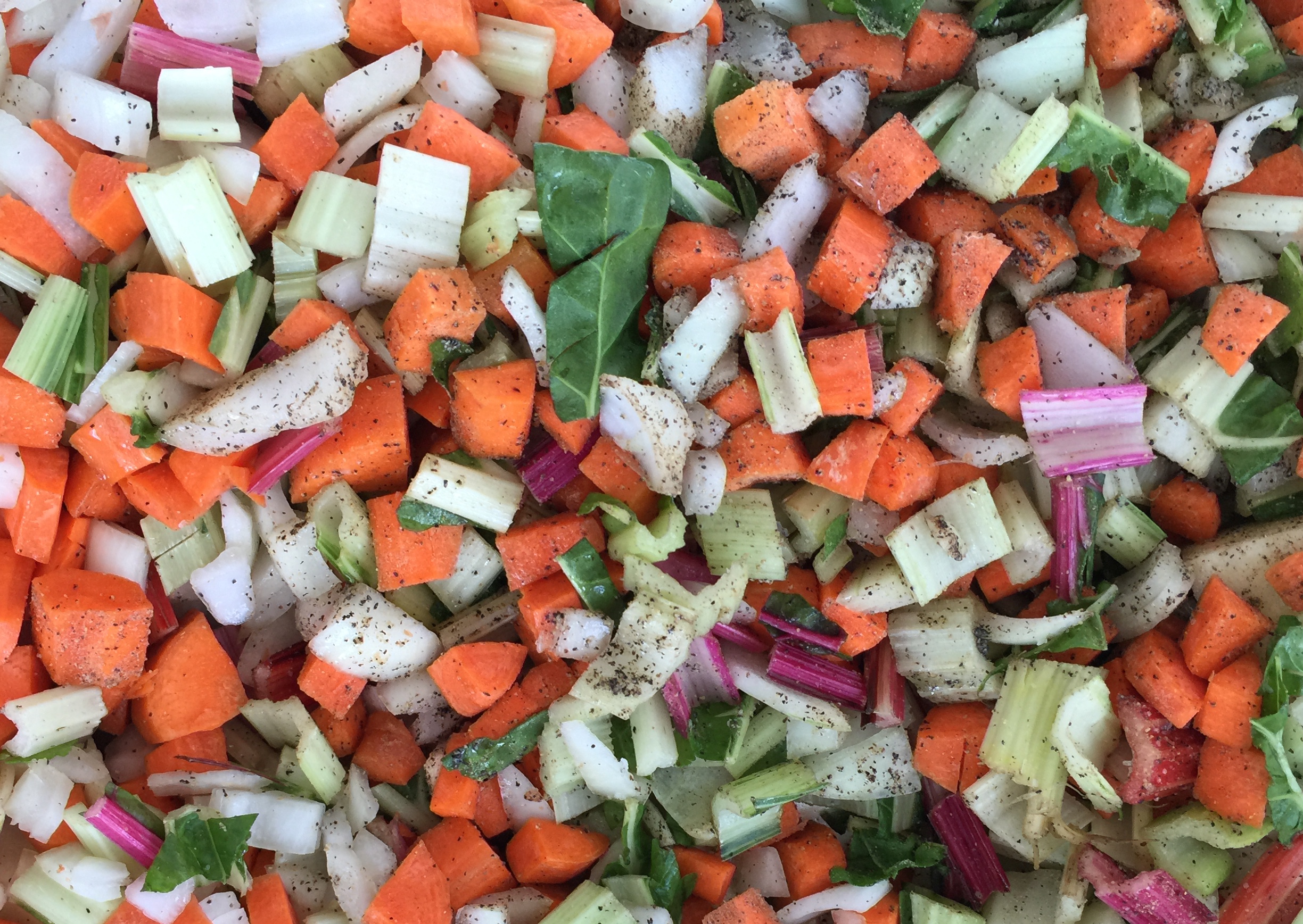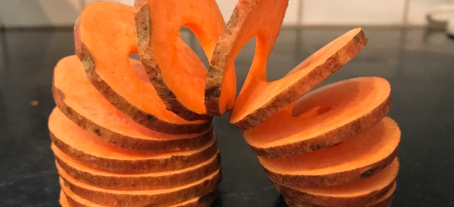 I mix the potato core from the spiralizer and the slinky-like potatoes with olive oil, garlic pepper, and salt, and roast them in a 425º oven. We call this side dish Nuts and Bolts Potatoes.
