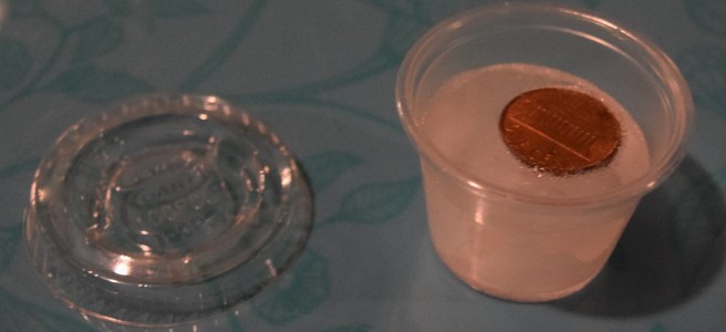 When water is frozen, place a coin on top of the ice and put the lid on.