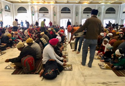 For 500 years Sikhs have been feeding people in this hall that is now air-conditioned. As people exit from one end, volunteers come in and sweep and mop the floors, followed closely by a new group of dinner guests entering from the other end of the building.