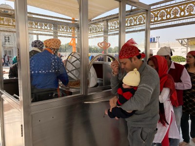That first morning, we drove into downtown Dehli where Ravi pulled over at a busy corner, and like magic, in jumped our red-turbaned tour guide named Daljeet. They decided to take us to Daljeet’s place of worship, a Sikh temple known as Gurudwara Sis Ganj Sahib built in 1783. It is one of ten Sikh gurudwaras in India. It was not on our original itinerary, but it became one of the most memorable, serendipitous stops of our trip for reasons to be explained.